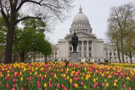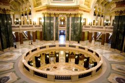 The Wisconsin State Capitol is in Madison, Wisconsin, in the center of the Madison Isthmus in downtown Madison, bordered by streets that make up the Capitol Square. It houses both chambers of the Wisconsin Legislature along with the Wisconsin Supreme Court and the Office of the Governor. Completed in 1917, the building is the fifth to serve as the Wisconsin capitol since the first territorial legislature convened in 1836 and the third building since Wisconsin was granted statehood in 1848.